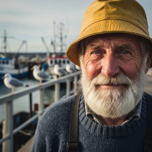 Prompt: Photorealistic portrait of a weathered, elderly fisherman with deep-set, kind eyes and a thick, white beard. He is wearing a heavy-knit, navy blue sweater and a worn, yellow rain hat. The lighting is soft and natural, coming from the side, highlighting the wrinkles on his face. The background is a slightly out-of-focus harbor with fishing boats. Shot on a DSLR with an 85mm lens, f/1.8 aperture, creating a shallow depth of field.