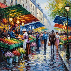 Prompt: An impressionist oil painting of a bustling Parisian street market in the late 19th century. The scene is filled with people in motion, their forms suggested with quick, thick brushstrokes. Sunlight filters through the colorful awnings of the market stalls, dappling the cobblestone street. The color palette is vibrant, with an emphasis on blues, yellows, and reds. In the style of Claude Monet.