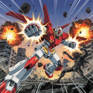 Prompt: A dynamic, high-energy anime scene of a giant, red and white mecha battling a monstrous alien creature in the ruins of a futuristic city. The mecha is mid-punch, with dramatic speed lines emphasizing the motion. Debris flies through the air, and explosions light up the background. The art style is reminiscent of 1990s mecha anime, with sharp angles and a vibrant, saturated color palette.