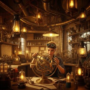 Prompt: A detailed steampunk-inspired image of an inventor's workshop. The room is cluttered with fantastical contraptions, exposed gears, and glowing vacuum tubes. In the center, a woman with welding goggles pushed up on her forehead is tinkering with a complex, brass astrolabe. The lighting is warm and comes from various lanterns and gas lamps scattered around the room. The overall mood is one of creative chaos and wonder.