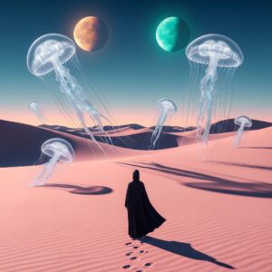 Prompt: A surrealist dreamscape where giant, luminous jellyfish float through a desert of pink sand. A lone, faceless figure in a long, flowing cloak walks towards a horizon where two moons hang in a turquoise sky. The scene is bathed in a soft, ethereal glow. The style is reminiscent of Salvador Dalí and René Magritte, with a smooth, almost photographic quality to the impossible elements.