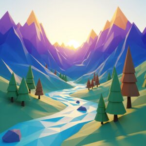 Prompt: A vibrant, low poly landscape of a mountain range at sunrise. The mountains are composed of sharp, geometric planes in shades of purple, blue, and orange. A winding river, made of simple, flat polygons, flows through the valley. A few stylized, conical trees dot the landscape. The overall effect is clean, colorful, and serene.