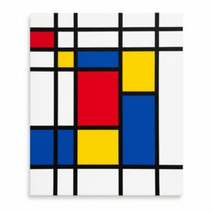 Prompt: An abstract geometric composition in the style of Piet Mondrian. The image consists of a grid of thick, black vertical and horizontal lines. Some of the resulting rectangles are filled with solid primary colors: red, yellow, and blue. The background is a clean, solid white. The overall design is balanced, minimalist, and harmonious.